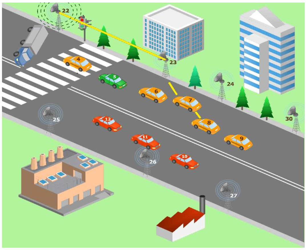 In this case, the communication is forwarded via a mediator known as a roadside unit.